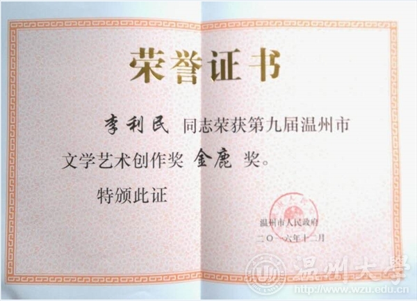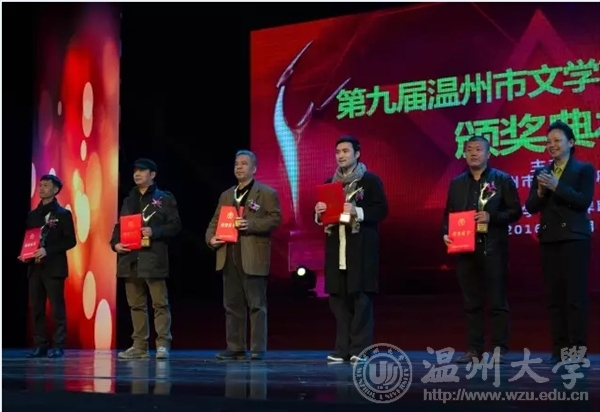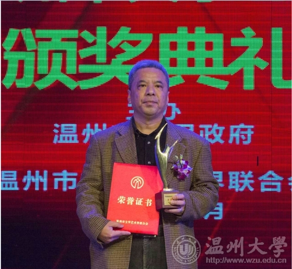 2016年12月29日下午,由温州市人民政府主办,温州市文学艺术界联合会承办的第九届温州市文学艺术创作奖颁奖典礼在温州市工人文化宫成功举办。beat365亚洲体育在线官网李利民老师荣获金鹿奖,该奖项是温州市政府设立的文艺最高奖,每三年评选一次,温州市委常委、宣传部长胡剑谨,温州市副市长郑朝阳出席颁奖典礼并给金鹿奖获得者颁奖。