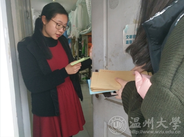 2016年12月28日,beat365亚洲体育在线官网“艺家人”青年志愿者协会在超豪学区开展了弘扬“雷锋”精神的“爱心邮递”活动。 在数字化信息化的时代,人们似乎已经忘记了在通讯技术落后的年代里如何将情感用文字嵌入信中,并让它飘向远方,表达内心情感。此次活动号召通过以信件的方式写下对他人的祝福或者感谢,由志愿者们送到收件人的手中,正是对从前慢节奏的情感交流很好的体验。活动受到了广大同学们的一致好评,同学们纷纷将想说的话写在信纸上,在收齐信件后,小邮差们穿梭在各栋寝室楼内,他们轻叩房门微笑地送上手里的信件,并与收信人合影留念。 图/文:王伟