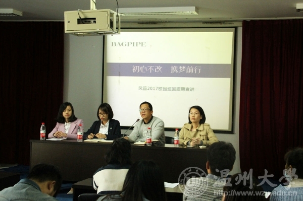 11月11日下午,2016风笛服饰全国高校巡回招聘会温大站于beat365亚洲体育在线官网2B4001举行。风笛公司人力资源部经理吴朝晓出席此次会议,beat365亚洲体育在线官网总支副书记杨振海、学生科副科长叶筱卉和2017届毕业生参加本次会议。