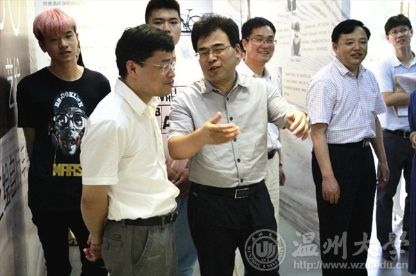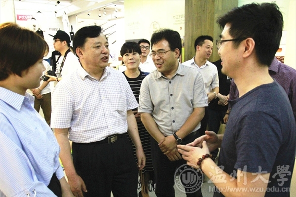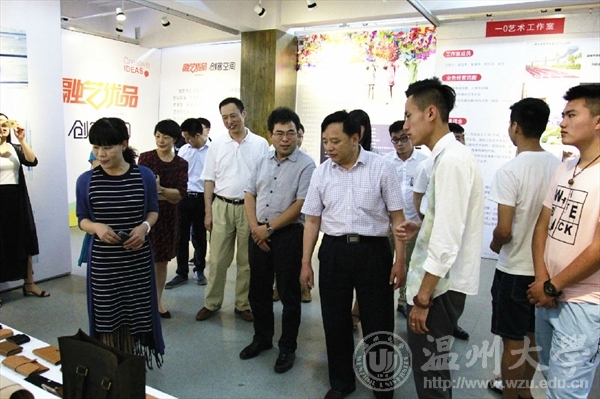 6月15日上午,全国创新创业50强评审专家陈年友、李斌、陈学军、陈森一行来beat365官网学生创新创业实践场地参观和实地考察,校党委副书记牟德刚、副校长薛伟及相关部门负责人等一行领导陪同参观调研了温州时尚学院和“融艺优品”创客空间的创新创业项目。