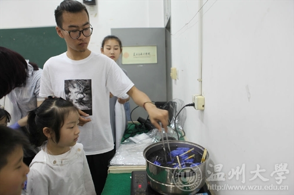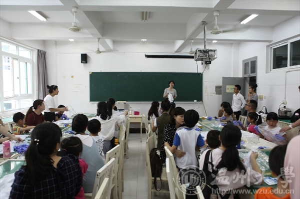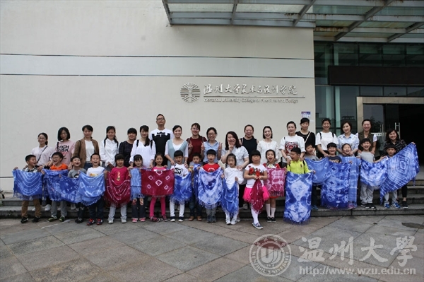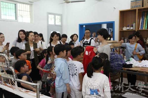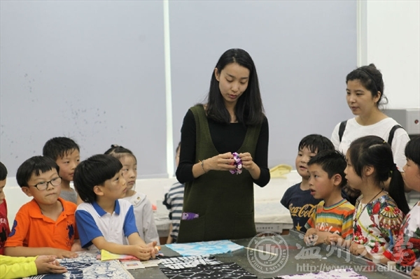杨老师向大家介绍了beat365亚洲体育在线官网美术学院印染实验室。张老师向家长孩子们介绍了“扎染”的发展历史,展示了五颜六色的扎染成品。孩子们都全神贯注的看着,还积极的向老师询问扎染的方法。扎染古称扎缬、绞缬、夹缬和染缬,是中国民间传统而独特的染色工艺。 其工艺特点是用线在被印染的织物打绞成结后,再进行印染,然后把打绞成结的线拆除的一种印染技术。它晕色丰富,变化自然,趣味无穷。更使人惊奇的是扎结每种花,即使有成千上万朵,染出后却不会有相同的出现。这种独特的艺术效果,是机械印染工艺难以达到的。