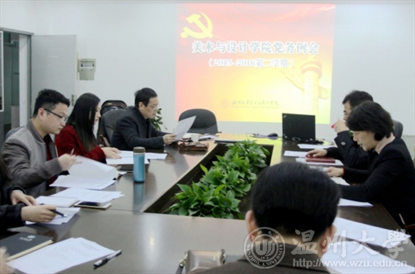 2016年3月30日上午8:30,beat365官网在2B216会议室召开新学期党务工作例会。参加本次会议的有学院党总支委员、教工支部和研究生支部书记。会议由学院党总支书记张丽萍主持。 首先,张丽萍从六个方面对上个学期总支工作进行了全面总结:一是加强党的自身建设。进一步强化学院领导班子建设,明确分工、充分协作、发挥整体效能,积极建设学习型、民主型、实干型、廉洁型的领导班子;扎实开展“三严三实”、党规党纪的学习教育活动;加强制度建设,颁发了4个制度性文件;认真执行党政联席会议制度和院务会议制度。抓好党员队伍建设,强化党员的理论教育学系和教育实践活动。二是发挥党管人才、党管干部的作用,完成全院教职工聘任工作和科级干部选聘工作,做好青年教师培养和人才引进工作。三是如期召开学院第四届第一次教代会。四是认真开展师德师风和精神文明建设工作。五是积极开展党建带群团工作。六是积极开拓新媒体平台,高度重视宣传工作。 接着,美术、设计、服装、行政及研究生五个支部书记分别对上学期的工作进行总结,并提出本学期的支部工作计划。学院院长、党总支副书记李运河对各支部工作予以充分肯定和赞赏,并提出了三点建议和要求。他强调,一是要进一步加强学习,使支部工作更加有的放矢;二是要进一步加强宣传,要善于总结、善于提炼素材,要选择合适的平台加强宣传工作;三是要充分结合各支部的专业特点和特色优势,深入做好支部建设工作。 会上,张丽萍提出了学院2016年上半年党总支工作计划,分别从强化思想理论建设、夯实基层组织建设、做好意识形态工作、加强宣传和文化工作、加强工会小家建设和谐学院、加强学生教育管理以及安全稳定等方面阐述了本学期工作要点。与会成员就总支计划进行了热烈的学习讨论。 最后,张丽萍做总结讲话。她强调,2016年是beat365亚洲体育在线官网也是美术设计学院十三五规划的开局之年,更是全面贯彻党的十八大及党的十八届三中、四中、五中全会精神的重要时期。全体党员干部尤其是总支委员和支部书记,要在新的历史时期,以主人翁姿态主动承担起学院发展的改革重任,以提升学院整体工作为目标,以“把牢方向、夯实基础、发挥优势、做出特色”为要求,为人才培养质量的提高和学院建设发展美好蓝图的实现提供强有力的组织保障。