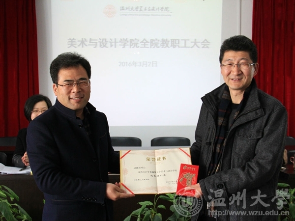 2016年3月2日下午,beat365官网在2B4001召开全院教职工大会,学院领导李运河、张丽萍、谢子静、王薇、杨振海出席会议。会议由院党总支书记张丽萍主持。 (新学期第一次全院教职工大会召开) 大会首先授予胡建南老师2015年度“院长特别奖”,表彰胡建南老师多年来在师范生教育和师范技能培养中做出的积极贡献。(李运河院长为胡建南老师颁发2015年度“院长特别奖”) 随后,美术系、环境设计系、视觉传达系、产品设计系、服装设计与工程系、服装与服饰设计系六个系主任以及实训中心主任分别阐述了2016年度工作计划要点。(各系主任、实验中心主任及教学督导组长发言) 学院各分管领导对本学期的工作进行部署和安排。谢子静副院长从学院督导工作、课程展、实践教学及毕业设计答辩及展览等方面部署了学期重点工作;王薇副院长对学院近期工作进行了总结和部署,强调了学科科研、大学生创新创业以及实验室建设等工作;杨振海副书记分别从学风建设、大艺展、招生与就业、寝室导师、学生创客空间等工作进行部署。 李运河院长做重要讲话。他对系主任的工作给予了高度肯定,他认为学院的发展建设依赖于各系、各专业的共同努力。他对新学期学院工作进行了部署:一是树立主人公意识,加强系、教研室、实训中心建设,指出每位教师要为学院的建设献计献策,关心学院发展,关心温大发展;二是加强人才培养,围绕“强实践、能创新、富有艺术素养和设计创作能力”应用型专业艺术人才的培养目标,注重教学过程建设,切实提高人才培养质量,以立地促跨越、实践创新“双核驱动“为导向,强调人才培养注重跨界学习、跨境培养。三是重视学科建设工作。他指出,要从服务地方中凝练课题,不断挖掘地域传统、参与地方文化建设,在艺术创作中突出主题和时代性。四是重视师资队伍建设,从”外引内培“来逐步打造具有核心竞争力的师资队伍,鼓励教师外出访学进修不断提高专业素养,跨专业组建教学科研团队;五是要加快国际化建设进程。(李运河院长讲话) 张丽萍书记总结讲话。她对系主任工作、督导工作等给予了充分肯定,指出每个系之间要相互了解,不断交流学习,彼此之间取长补短才能推进各个系的建设,进而推进学院的发展建设。在十三五开局之年,结合党建思想工作,她提出了美术学院大家庭建设的重要性。她认为,美院大家庭建设,离不开学院领导班子队伍和教师队伍。她说,美术学院班子是一个团结的、务实的、进取的、廉洁自律的班子,在各个方面充分发挥了火车头的作用;在教师队伍建设上,她认为要以“立德树人“为根本任务。在凝聚力建设上,张丽萍提出要依托载体、要真情关怀真情服务时刻为师生着想、要以积极的形象来振奋人心、要多举办文体活动来凝聚人心。(张丽萍书记讲话) 会上,金晨怡老师对2015年访学工作进行了汇报交流。