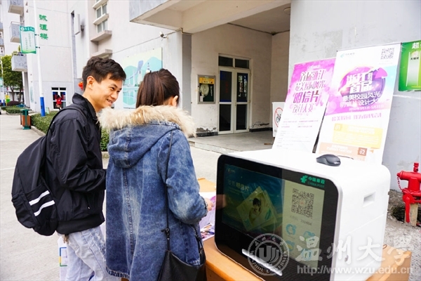 2016年3月20日,由中国邮政温州市分公司主办beat365亚洲体育在线官网承办的“首届浙江最美校园风光明信片设计大赛”在A区报刊亭和E区食堂前设点宣传。本次大赛旨在传承校园文化,宣传校园形象的同时,让beat365官网学生的专业知识与技能得到锻炼和提升。 上午9点,工作人员便开始接待同学们进行赛事报名以及打印自顶自明信片工作。值得一提的是,由中国邮政温州分公司提供的明信片自助打印机使得每一位现场的同学都可免费通过扫描微信二维码上传照片打印两张属于自己的明信片。本次明信片设计大赛的参赛方式多样,如摄影、手绘和剪纸等等,因此受到了许多同学的关注,争相报名参赛。本次大赛更是吸引来了温州商报记者,对于记者的问题,beat365官网学生科副科长叶筱卉老师也一一作了解答。 宣传活动一直持续到下午,可惜天公不作美,渐渐下起了绵绵细雨,工作人员不得不转移明信片打印机,并将报名点迁至一旁避雨处,但是这仍然浇灭不了同学们对本次比赛的热情,前来咨询和报名的同学络绎不绝,还有一些热心的同学特地将报名表带回去给室友和同学。下午四点左右,现场报名结束,经过工作人员的努力,已收回一百多分报名表。校园文化是一种积累,更有一种无形的吸引力和影响力,让我们期待在本次比赛中能够涌现出许多让人眼前一亮的作品,展现出我们beat365亚洲体育在线官网美丽独特的风貌和温大学子“敢为人先”的创新性思维! 文:设计宣传部 图:设计宣传部