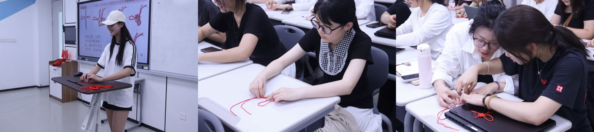 随后进入“中国结”手工实践环节。在主持人的引导下,同学们认真观看教学视频,亲手编织中国结。在一根红绳的千回百转中,大家不仅体验了传统手工艺的独特魅力,更感悟到其中蕴含的爱国情怀与廉洁精神,将抽象的价值理念转化为具象的艺术表达。