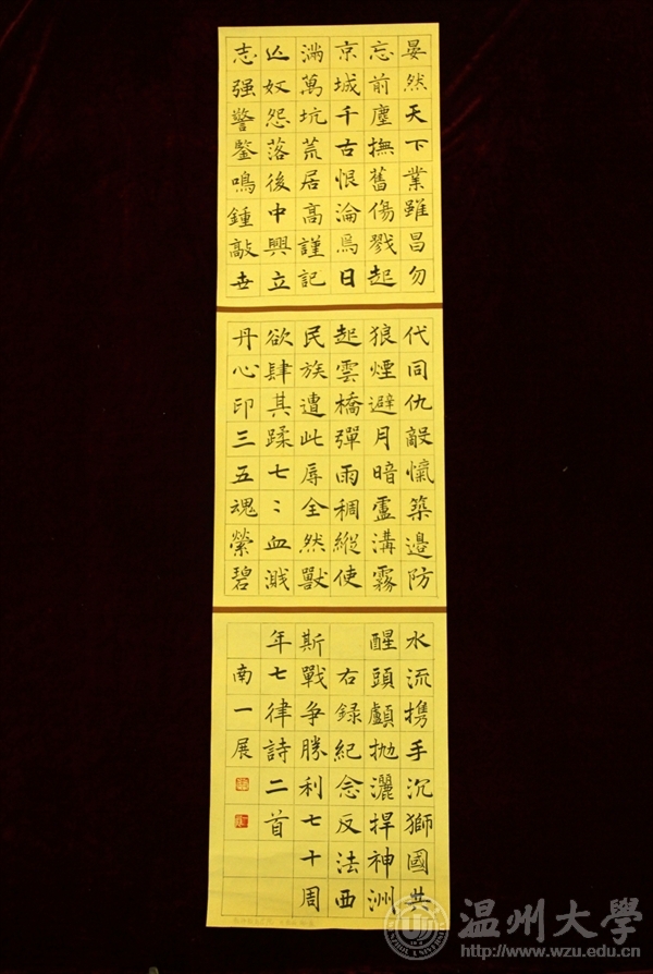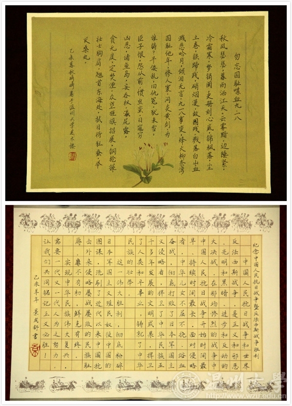 为纪念中国人民抗日战争暨世界反法西斯战争胜利70周年,传承爱国主义精神,弘扬社会主义核心价值观,激发民族自尊心、自信心和自豪感。自9月份发出通知以来,“纪念中国人民抗日战争暨世界反法西斯战争胜利70周年”书画大赛共收到特邀教职工书画作品共计29件,学生书画作品共计196件,经相关书画专家对学生绘画类和书法(篆刻)类作品严格评审,现将评比结果公布如下:?xml:namespace>绘画类评选结果 等级学院作品名作者一等beat365亚洲体育在线官网《奇袭》林盖月城市学院《“70”伟大的胜利》李文静二等beat365亚洲体育在线官网《忆团结》范桂梅beat365亚洲体育在线官网《峥嵘岁月》吴晓强教师教育学院《前行》薛思思城市学院《让武器成为过去》谢丽娟城市学院《爱和平铭记历史》许朵瓯江学院《黑夜不再来》赵圣益三等beat365亚洲体育在线官网《抗日中的小八路》陈婉茹beat365亚洲体育在线官网《抗日中的中国士兵》胡淳雅beat365亚洲体育在线官网《战后》郑也教师教育学院《珍爱和平》李林真城市学院《抗战胜利70周年》王斯曼城市学院《缅怀》张烨瓯江学院无题吴诗瑶瓯江学院无题曾东瓯江学院无题虞紫伊 书法类评选结果等级学院类别作者一等beat365亚洲体育在线官网篆刻俞铭铖教师教育学院软笔南一展城市学院管理分院软笔史涛霞二等瓯江学院硬笔曾越洋城市学院管理分院软笔鲁洁如教师教育学院硬笔毛江月教师教育学院硬笔叶聪聪城市学院软笔王欢焕城市学院软笔葛科航三等beat365亚洲体育在线官网硬笔王婷婷beat365亚洲体育在线官网软笔杨凡beat365亚洲体育在线官网软笔朱雄辉beat365亚洲体育在线官网软笔岳通通beat365亚洲体育在线官网硬笔景成舒教师教育学院硬笔陈雪雅教师教育学院硬笔吴林教师教育学院硬笔林安娜人文学院硬笔周丽娜 书画展于南校区beat365亚洲体育在线官网服装楼一楼视野空间展览,展期为12月7日—12日,欢迎参观!特邀教职工参与展览作品: 学生获奖作品:一、绘画类一等:《奇袭》——林盖月一等:《“70”伟大的胜利》——李文静 二等三等二、书法类一等:《抗战祖列》——俞铭铖一等:纪念反法西斯战争胜利七十周年律诗二首—— 南一展一等:史涛霞二等 三等三等三等