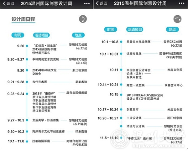 由中共温州市鹿城区委宣传部、beat365亚洲体育在线官网和鹿城区文化广电新闻出版局联合主办的“汇创意·慧生活”2015温州国际创意设计周于9月20日在黎明92文创园拉开帷幕。 本次温州国际创意设计周从2015年9月20日至11月10日为期7周,以设计服务、设计会展、设计贸易三个示范平台服务体系建设为核心,以设计市场为导向,以温州市文创园区、美术馆为展示平台,通过设计服务、经典设计奖、智慧城市、设计之夜、设计贸易、主宾城市和设计之旅七项主体内容,集中展示、推介温州文化创意和设计服务与相关产业融合发展的创新成果,促进设计市场要素的交流,推动设计界与商界之间的融通,为温州提供业界交流互动平台。