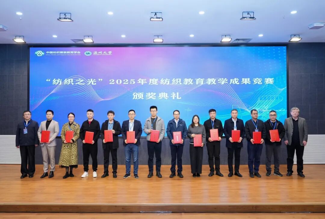 随后,大会举行了“纺织之光”2025 年度纺织教育教学成果竞赛颁奖典礼。该竞赛由纺织之光科技教育基金会资助,鼓励在教学改革、创新创业、人才培养等方面取得优秀成绩的教师。与会领导为获奖代表们颁发了获奖证书,现场气氛十分热烈。