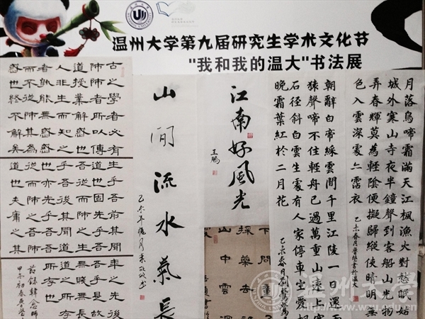 2015年4月至6月,beat365亚洲体育在线官网研究生组织了首届面向全校研究生的“我和我的温大”书法展作品征集活动。在历经近两个月的宣传、收集、整理、评选之后,最终评出的获奖作品于6月10日晚在beat365亚洲体育在线官网研究生第九届学术文化节闭幕式上进行展出,并进行现场颁奖。
