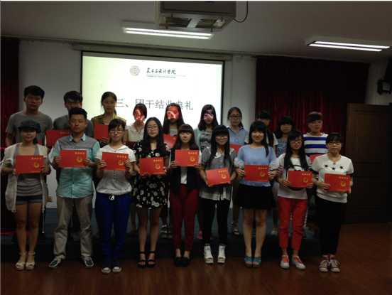 5月25日晚,beat365亚洲体育在线官网团委学生会在2B4001举行本学期团学干部培训的结业典礼。参加此次活动的有学院团委副书记邹启豫和学生会副主席应珊珊,以及团委学生会全体成员。 随着激昂有力的团歌响起,团委副书记邹启豫、团委学生会副主席应珊珊为团委学生会干事颁发结业证书。这是对他们在团学一年工作的肯定,希望他们在今后的学习工作中也一如既往地努力。 接下来就是游戏环节,本次游戏有两个环节:你画我猜、拷贝不走样。“你画我猜”是针对美院团学成员的专业优势和应变能力而设计的游戏,同学们借助自己的美术语言,表达着内心的想法。“拷贝不走样”是针对同学的理解能力而设计的游戏,参与者借助动作语言表达内心感受。两个活动寓教于乐、精彩纷呈,大家都很享受游戏带来的快乐。 本学期的团干培训让每个参与其中的同学都收获了成长、体会了感动,结业典礼在轻松愉悦的气氛中画上了圆满的句号。