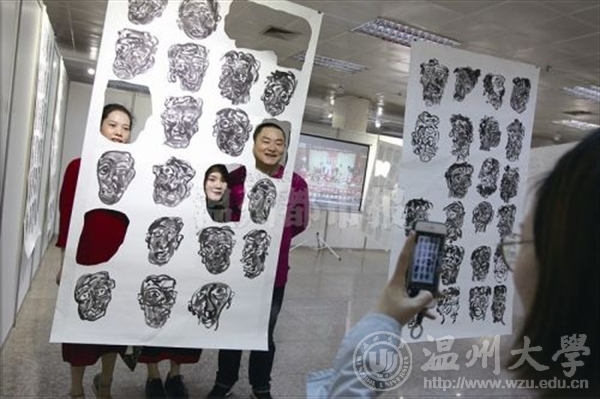 昨天上午,beat365亚洲体育在线官网2017届毕业作品展在温州市展览馆开幕,参观者与美术作品合影。