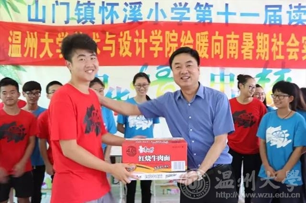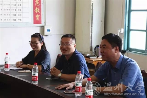 7月15日上午,校党委委员、副校长钱强在校团委副书记魏一、美院党总支副书记杨振海、校团委办公室成晓等陪同下,专程赴平阳县怀溪镇中心小学亲切慰问beat365官网“绘暖向南”暑期社会实践队,怀溪镇委书记金建辉陪同慰问。