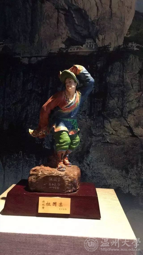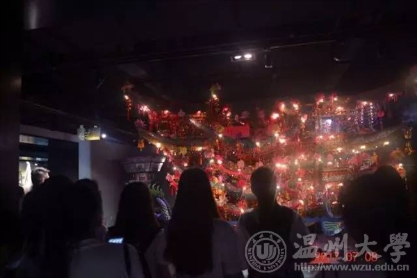 温州市非物质文化遗产馆分为瓯海馆,龙湾馆,鹿城馆,乐清馆,瓯窑馆和温州“三瓯”区等。瓯窑,瓯绣,瓯塑便是有名的温州三瓯,我们还观摩了木活字印刷使用的模板,浙江“三雕”之一的黄杨木雕,还有细纹刻纸等等令人惊叹不已得非遗工艺品。最令人惊叹的要数首饰龙了。首饰龙其实是一艘龙形的大船,前有龙头,后有龙尾,龙身是摆放了许多人像雕塑的楼阁。非遗馆里的首饰龙可以接通电源,寂静的庞然大物在通电的一瞬间突然活了过来,通体光亮,里面的人物开始移动,龙尾摇摆,令大家惊叹不已。参观结束后,副队长还组织了“寻找你心中最美的‘非遗’作品”的活动。我们全队共分为五组,分别去拍摄一张非遗作品的照片。然后,各组通过抽签交换拍摄的照片,并根据照片在规定时间内去寻找实物,在寻找出作品的同时也增加了大家对于工艺的热爱。