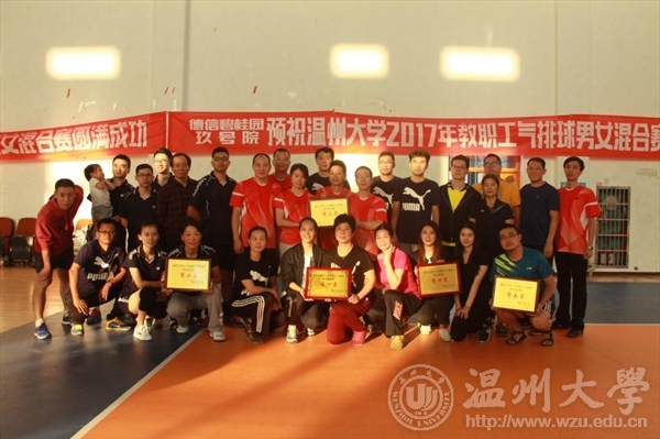上周,我校工会举办了2017年“碧桂园杯”教工气排球男女混合赛。本次比赛共有17个分工会约170位教职工参赛。第一阶段的比赛于10月25在北校室外排球场举行,beat365官网以小组第二的成绩晋级复赛。第二阶段于28日在北校区体育学院室内球馆举行,经过奋勇拼搏,最终取得了第五名的历史最好成绩。体育学院代表队获得第一名,瓯江学院代表队、后勤代表队、成教学院代表队、美术学院代表队、数学学院代表队分别获得前六名。