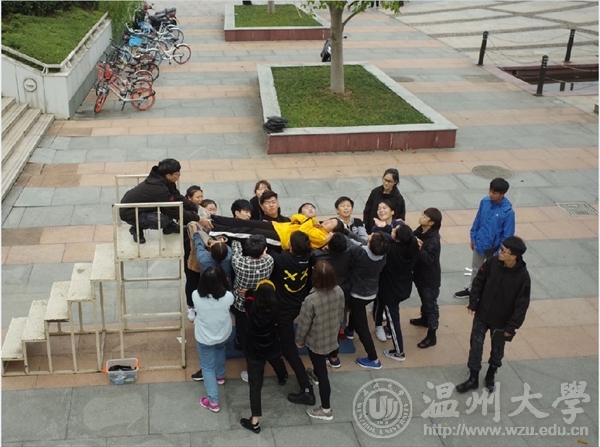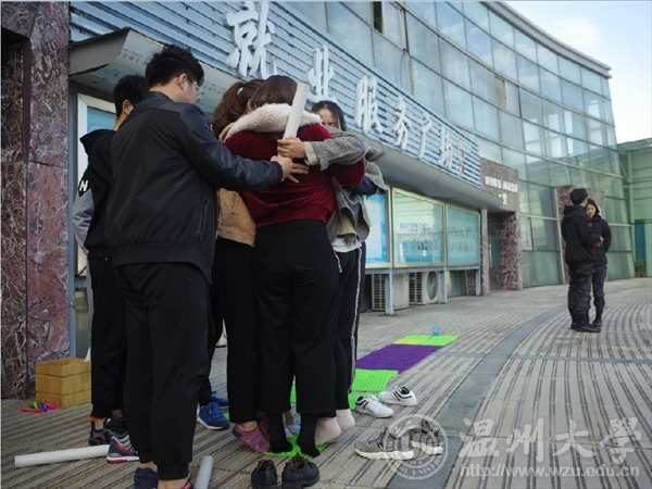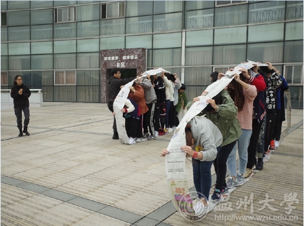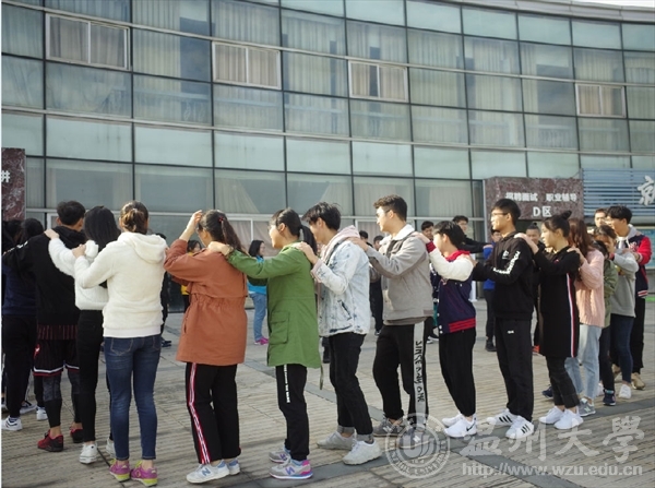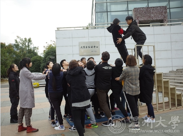 团干第一次户外培训活动在周日下午如火如荼的展开。突如其来的冷空气也阻挡不了同学们的热情。同学们在大学生活动中心依次排好等待培训的开始。一个成功的队伍必须拥有炫酷的队名响亮的口号和统一的队歌。同学们在短短十分钟内发挥想象在大卡纸上刷刷画下了队名和图案,并在完成后在各个队伍前展示。第一个项目是兔子舞同学们整齐的排成一个圈,接受重重挑战。这个项目不仅挑战了同学们的协调性也考验了大家的反应能力。在活动中反应不够灵敏的同学接受惩罚时也引起了同学的爆笑。从第二个项目开始,同学们分为两组分别进行活动。其中一二队同学进行的项目是挑战五分钟。同学们一个接一个用手中的管子运输小球,通过指压板,将小球投进篮中胜利。接下来一连串的项目都是靠大家齐心协力才能完成,默契最佳的组才能获胜。三四组同学的项目是贪吃蛇,两队除了蛇尾外的同学都带上了眼罩,在黑暗中,位于蛇头的同学在地上摸索着散落的木块,项目的关键就在于蛇尾同学的指挥和蛇身同学们的传达,一个协调的整体才能取得成功。接下来一二两组的项目是信任背摔。同学站在一米以上的站台上克服内心的恐惧,往后笔直一摔让背后搭成人桥的同学接住他才算成功。这一项目考验了同学们间的信任度与勇气。三四两组进行的是团队运输,将报纸做成履带同学们作为轮胎在起点与终点间运输气球,同学们默契配合,才能在短时间运输完成。最后一个项目是一方有难八方支援,同学们发挥出无私奉献的精神,应要求纷纷奉献出自己的衣服、鞋子、袜子、甚至是自己。在热火朝天的氛围中,培训画下了完美的句号。在此次培训中,团干们在互动中增进了情感,在比赛中培养了团队协作精神与默契度。相信团干培训活动会越来越顺利。