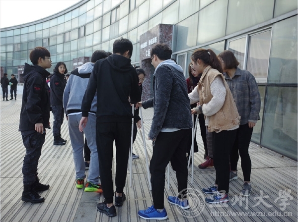 三四组同学的项目是贪吃蛇,两队除了蛇尾外的同学都带上了眼罩,在黑暗中,位于蛇头的同学在地上摸索着散落的木块,项目的关键就在于蛇尾同学的指挥和蛇身同学们的传达,一个协调的整体才能取得成功。