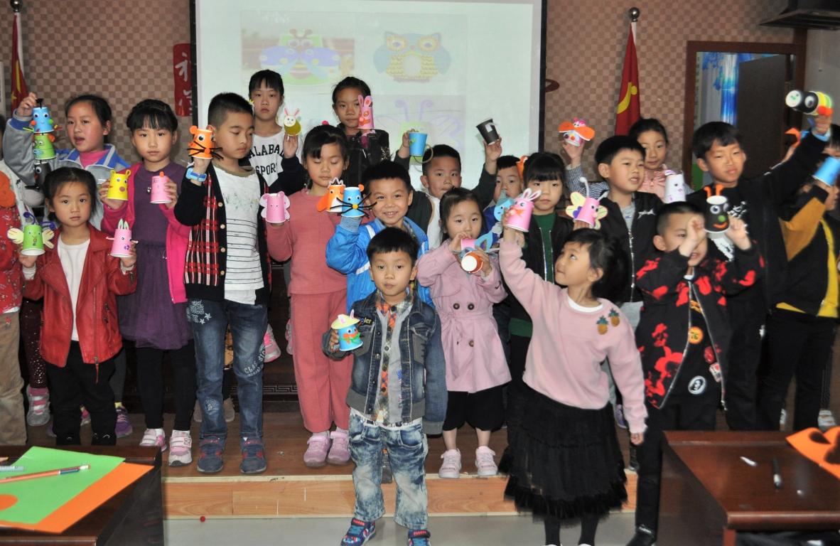 本期授课志愿者徐静同学带来了五颜六色的纸杯和各种彩纸,由志愿者和小朋友们一起将纸杯改造成各种小动物的形状。大家跃跃欲试,天马行空,有剪成蝴蝶的形状的,也有的剪出了一对兔耳朵,小朋友们的世界可真是充满了未知和梦幻!不到一个小时,大家都完成了自己的创作。从每个人的作品都能看到他们改造时的快乐,纸杯上大大的眼睛,五彩的花纹,还给纸杯接上了尾巴,更显有趣。当然,我们可不能浪费这美好的春日阳光,志愿者们带着小朋友走出礼堂玩起了户外游戏:石头剪刀布、跨步游戏、打乒乓球、摘四叶草……之后,大家又回到礼堂进行折星星的手工活动,这些星星如同来自天上,一闪一闪的,承载着美好回忆。