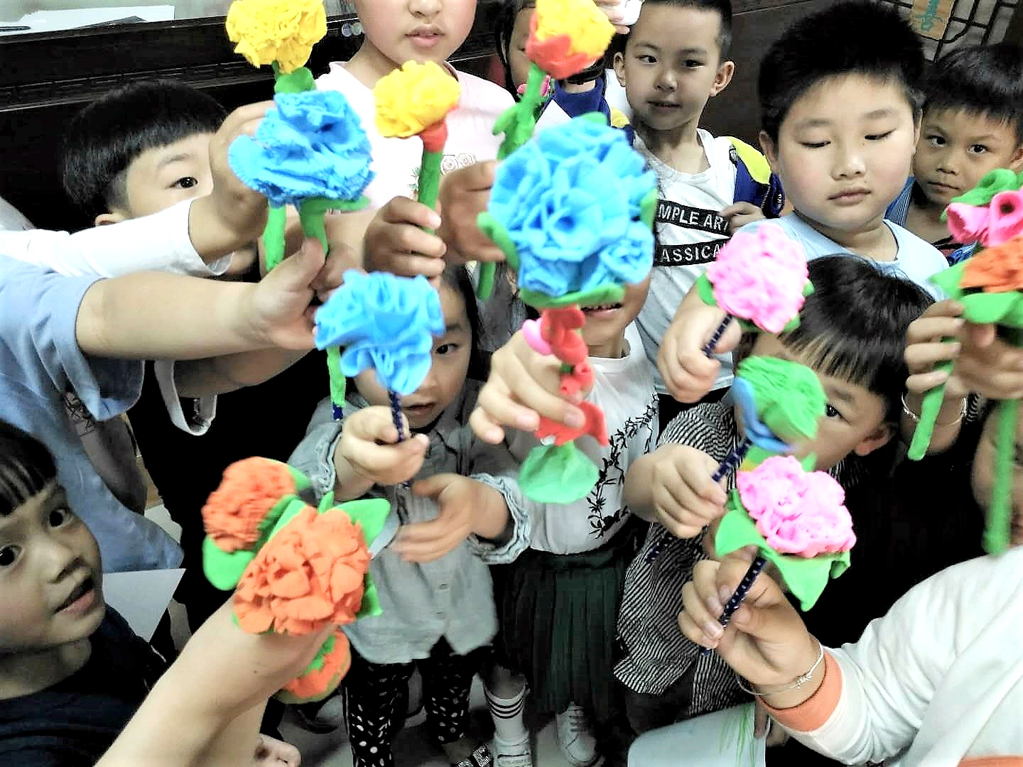 此次活动内容主要是用橡皮泥制作康乃馨,将亲手制作好的花送给自己的母亲,给辛苦操劳的母亲一个惊喜。把一块块橡皮泥,捏成花的样子,有红的有蓝的……娇艳欲滴。活动过程中小朋友和志愿者们捏的不亦乐乎,相互比拼着彼此的花朵,炫耀着自己的成果,再加上后来橡皮泥的上色,显得“花朵”更加鲜艳,像是有了香味一样。经过一系列的修改,手上的花朵越来越精致,同时选出了前十名分发了奖品,没有得到名次的的小朋友也奖励了纪念品。