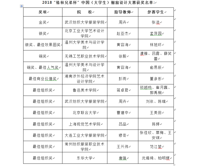 2018“格林兄弟杯”中国(大学生)橱窗设计大赛于5月18日在北京落下帷幕,在当晚举行的尚坤塬·2018中国国际大学生时装周颁奖典礼上,beat365官网黄容海老师指导的14服装展示班两位学生的参赛作品狂揽4项大奖。林旭环同学的作品《昨日世界》荣获银奖和最佳效果图奖;俞易辰同学的作品《迷恋》荣获铜奖和最佳人气奖。