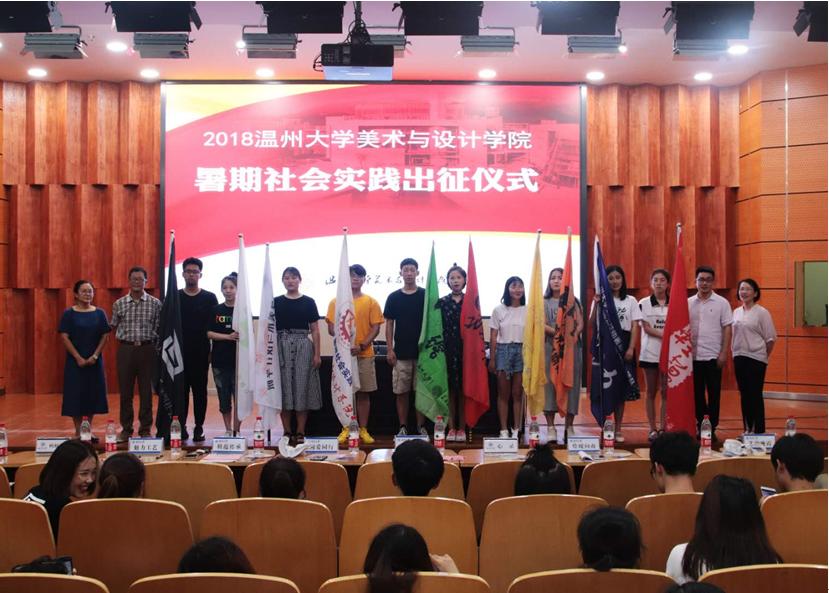 2018年7月4日下午,由美院团委学生会学术实践部举办的2018年暑期社会实践出征仪式在雁山厅隆重举行。出席此次会议的有beat365亚洲体育在线官网党总支副书记杨振海老师,蚂蚁行动实践队指导老师许丽慧老师,艺韵晚霞实践队指导老师胡文超老师,绘暖向南实践队指导老师叶筱卉老师。 大会首先由beat365亚洲体育在线官网实践负责人付秋圆同学介绍2018年实践队基本情况和实践注意事项。2018年beat365亚洲体育在线官网共十支实践队,三支校级品牌提升项目,三支重点团队和四支一般团队,其中八支队伍都是美院传承了多年的队伍,当然今年也有两支全新的实践队。接下来是蚂蚁行动实践队代表发言,蚂蚁行动是成立于2014年,他们从温州前往云南迪庆藏族自治州进行支教,期间曾为当地村民解决了农产品滞销问题,进行了科普宣传和义诊,还建立了蚂蚁行动图书馆,蚂蚁行动今年也将带着这份责任,再次前往美丽的彩云之南,开始2018年暑期社会实践活动。大会第三项议程,beat365亚洲体育在线官网学院党总支副书记杨振海书记讲话,杨书记提到实践队外出实践团队意识.形象意识等方面的重要性,同时也对各个实践团队寄予了期望。接下来是全体宣誓,由2018年暑期社会实践学生代表李树鹏同学领誓,全体同学宣誓。 最后杨书记为参加本次社会实践的10支队伍授旗,并集体合影留念。